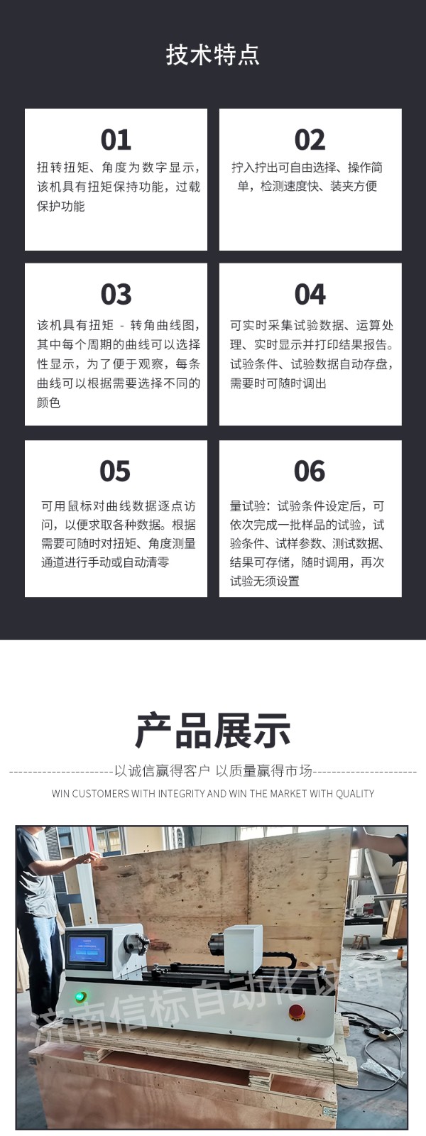 數(shù)顯扭轉(zhuǎn)試驗(yàn)機(jī)技術(shù)指標(biāo): 1 扭矩測量范圍:20Nm 2 扭矩分辨力:±1/300000 3 轉(zhuǎn)角最小讀數(shù)值:0.01圈 4 扭矩示值相對(duì)誤差:測量范圍內(nèi)優(yōu)于±1% (正轉(zhuǎn)和反轉(zhuǎn)兩個(gè)方向) 5 扭矩示值重復(fù)性相對(duì)誤差:測量范圍內(nèi)≤1% 6 試驗(yàn)機(jī)加載速度:0.004r/min~20r/min 7 兩夾頭間距離:0~250mm 8 兩夾頭間的同軸度誤差:≤Φ0.10mm 9 試驗(yàn)機(jī)超過額定扭矩的5%~10%時(shí),試驗(yàn)機(jī)自動(dòng)停機(jī)(也可以自行設(shè)置) 具有過電壓、過電流、超速、過載等安全保護(hù) 10 電源電壓:220VAC±10% 50Hz 11 主機(jī)尺寸:1700×700×1200(mm) 座式操作 功能特點(diǎn): 1、適用于WINDOWS平臺(tái)的中文試驗(yàn)軟件,實(shí)現(xiàn)試驗(yàn)數(shù)據(jù)采集處理。 2、可實(shí)時(shí)采集試驗(yàn)數(shù)據(jù)、運(yùn)算處理、實(shí)時(shí)顯示并打印結(jié)果報(bào)告。 3、曲線遍歷:可用鼠標(biāo)對(duì)曲線數(shù)據(jù)逐點(diǎn)訪問,以便求取各種數(shù)據(jù)。扭矩與扭角關(guān)系曲線中能反映任意點(diǎn)扭矩—角度的關(guān)系,能方便地在曲線上找到所求數(shù)據(jù)點(diǎn);可方便地對(duì)曲線局部放大還原等。 4、根據(jù)需要可隨時(shí)對(duì)扭矩、角度測量通道進(jìn)行手動(dòng)或自動(dòng)清零。 5、自動(dòng)存盤:試驗(yàn)條件、試驗(yàn)數(shù)據(jù)自動(dòng)存盤,需要時(shí)可隨時(shí)調(diào)出。 6、批量試驗(yàn):試驗(yàn)條件設(shè)定后,可依次完成一批樣品的試驗(yàn),試驗(yàn)條件、試樣參數(shù)、測試數(shù)據(jù)、結(jié)果可存儲(chǔ),隨時(shí)調(diào)用,再次試驗(yàn)無須設(shè)置。 7、打印試驗(yàn)報(bào)表。